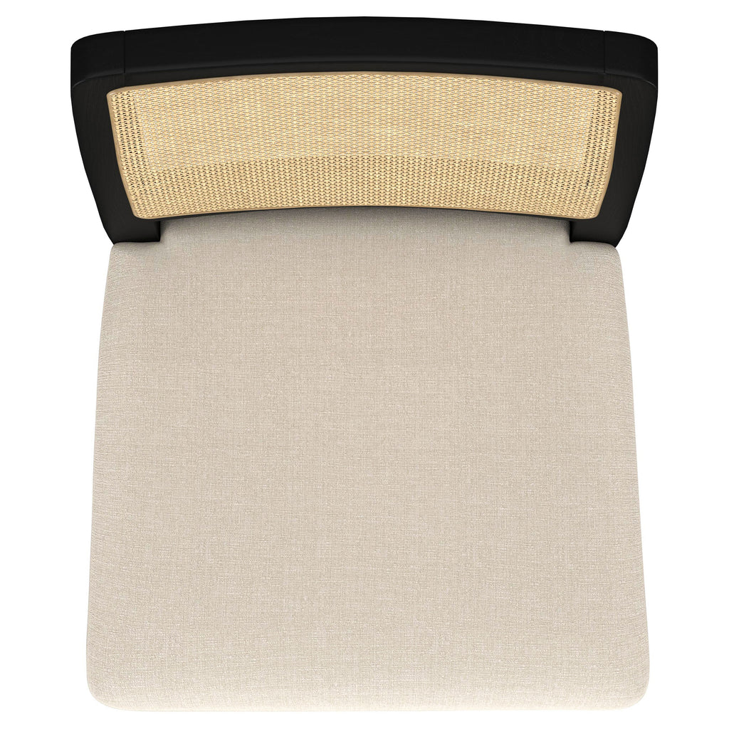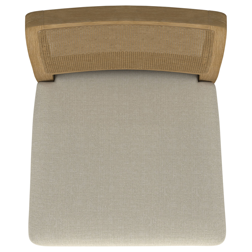 This dining set blends modern craftsmanship with natural textures for a refined yet inviting feel. The dining table features a trestle base with an antique brass-finished metal stretcher bar, adding stability and contrast. Rounded corners soften the rectangular top, while a removable 18-inch leaf allows for flexible seating. The dining chairs feature handwoven cane backrests, solid wood frames, and Pirelli webbed seat cushions upholstered in beige linen-like fabric for lasting comfort and support. A wood grain finish enhances the natural beauty of the materials. Key Features: • Dining set in sand wash finish includes a trestle table and handwoven cane-back chairs for style • Antique brass metal stretcher bar adds structural durability and visual appeal • Table expands effortlessly with a removable 18-inch leaf for extra seating • Handwoven cane backrests enhance texture and bring a natural aesthetic • Foam-padded beige fabric upholstered seat cushions provide lasting comfort and support • Solid wood, white ash veneer, and metal construction ensure strength and longevity