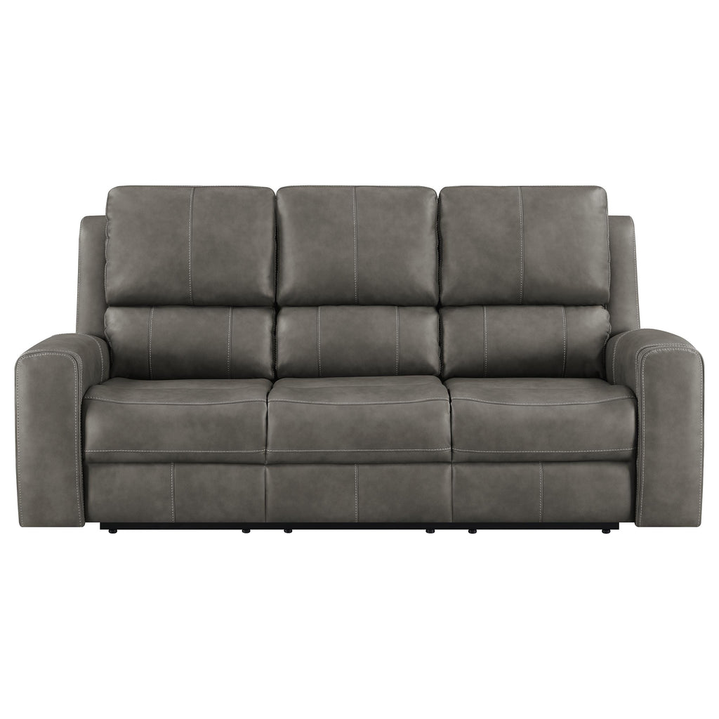 A sanctuary of comfort and thoughtful design, this triple power reclining sofa turns the everyday into something extraordinary. Upholstered in soft leatherette with contrast stitching, its sculpted silhouette offers both structure and serenity. Sink into deep, supportive cushions while power recline, headrest, and lumbar settings respond with effortless grace. A drop-down console reveals hidden storage and ambient LED lighting, while the sleek control panel—complete with dual USB ports—keeps everything within reach. Even in moments of stillness, a rear power connection and emergency battery option ensure comfort never loses power. Key Features: • Triple power reclining sofa with power headrest, power lumbar, and smooth recline functionality • Drop-down center console with lift-top storage and dual LED reading lights • Control panel includes USB-A and USB-C charging ports and a home button for quick reset • Rear AC power socket allows easy wall plug-in and houses 9V battery for emergency power-down • Armrests feature hidden compartments with built-in stainless steel cup holders • Charcoal leatherette upholstery with contrast stitching offers soft texture and modern style