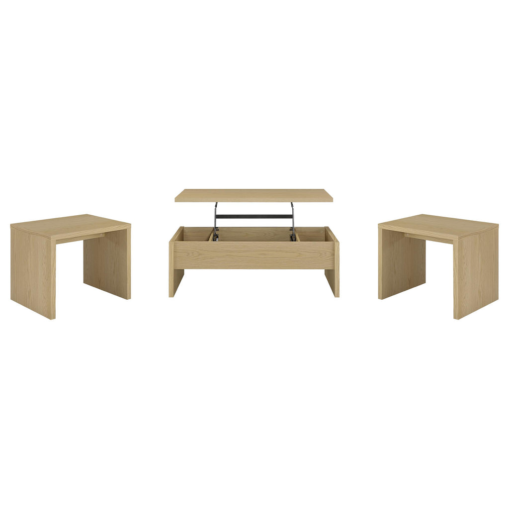 Rooted in clean geometry and modern ease, this coffee table set brings versatile function and understated style to any living space. The lift-top cocktail table offers hidden storage beneath a smooth surface that rises to meet your needs, while the coordinating end table features an open, minimalist form. With crisp lines, durable construction, and a warm woodgrain texture, this set blends casual utility with quiet sophistication for everyday living. Key Features: • Coffee table set with minimalist silhouettes and natural wood-inspired light oak finish • Lift-top coffee table features hidden storage for everyday essentials and remotes • Matching end table provides open sides and sturdy surface for lighting or décor • Flat tops offer generous space for books, trays, or casual entertaining • Crafted from engineered wood with melamine veneer for durability and easy care • Perfect for modern or transitional living rooms seeking functional, grounded design