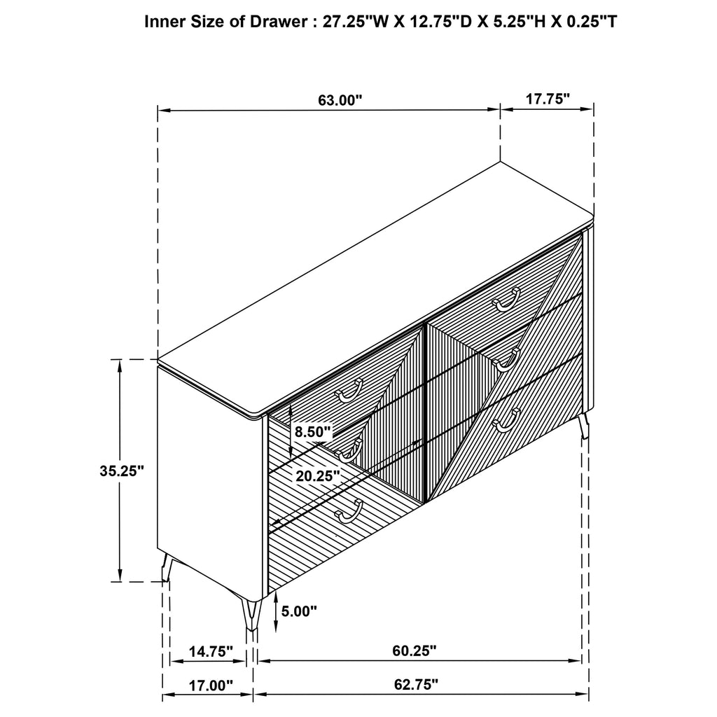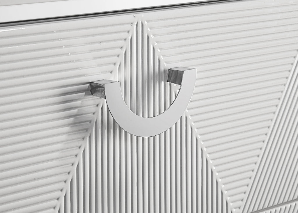 Crisp white high gloss and sculptural textures define this modern bedroom set, blending sleek surfaces with dimensional details. Geometric drawer fronts feature ribbed V-patterns and polished chrome pulls, while all drawers glide smoothly on 45mm metal extension hardware. The headboard stands out with chevron-tufted white faux leather framed by soft white LED trim. Completing the ensemble, a coordinating LED dresser mirror adds ambient glow and polished symmetry to the space. Elevated on chrome legs, this set is a showcase of contemporary form and function. Key Features: • White high gloss bedroom set with sculpted drawer fronts and chevron-tufted LED headboard • LED dresser mirror adds ambient lighting and visual symmetry to the modern design • All drawers include 45mm metal extension glides for smooth and reliable performance • Top drawers are fully lined in black felt to protect valuables and add elevated utility • Chrome U-shaped pulls and tapered acrylic legs provide sleek contrast and support • Crafted from engineered wood and faux leather for durability and shine