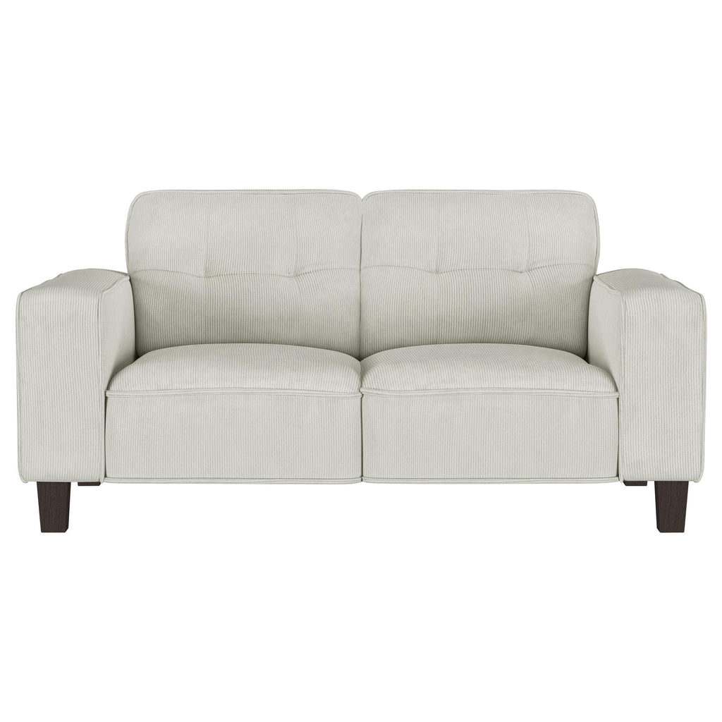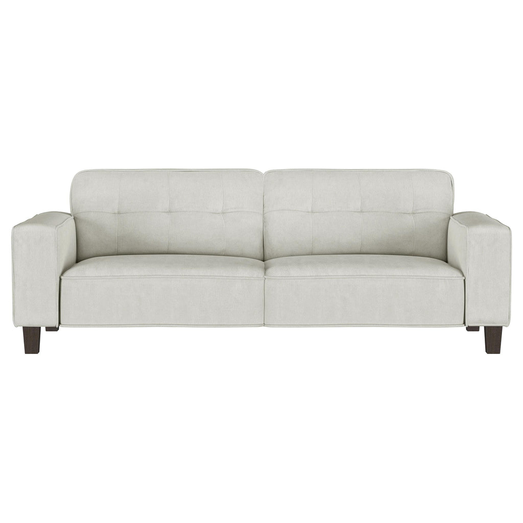 Infuse tailored elegance with the tufted details of a modern sofa set. Featuring a three-seat sofa and two-seat loveseat, this set offers a refined anchor for your living room seating. Smooth, soft upholstery adds neutral color, while plush foam and sinuous springs ensure optimal comfort. The sofa and loveseat each feature tufted back cushions, offering a refined touch of mid-century charm. Track arms define a straight, clean-lined silhouette that's simply timeless and each piece stands on dark brown finished tapered wooden legs that add airy height. Key Features: • Hints of mid-century character infuse charm into a two-piece modern sofa set • Plush back cushions are tufted to create a sense of depth and dimension in your living room • Inviting upholstery and plush foam cushions create incredible comfort for lounging or entertaining • Timeless silhouette features tapering dark brown finished wooden legs and wide, straight track arms • Sinuous spring decking supports seats and back for incredible comfort and support that lasts