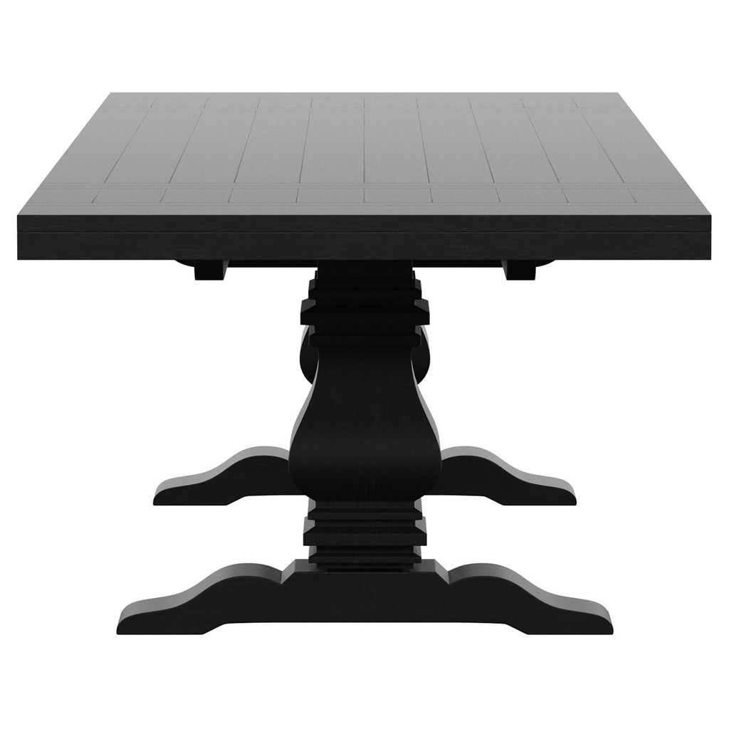 This rectangular extension dining table blends classic European elegance with artisan craftsmanship. Crafted from solid pine, it features a double pedestal trestle base that exudes romantic charm and timeless character. The sculpted pedestals, connected by a wide plank accent, create a striking focal point with an authentic handcrafted feel. A planked tabletop enhances its rustic appeal, while two 16-inch removable leaves extend the table up to 126 inches, making it perfect for gatherings large and small. Built for both beauty and durability, this table is an inviting centerpiece for any dining space. Key Features: • Rectangular dining table with a sculpted double pedestal trestle base • Crafted from 100% solid pine for strength and long-lasting durability • Two 16-inch removable leaves extend the table up to 126 inches • Wide plank accent between pedestals adds an artisan, handcrafted feel • Planked tabletop highlights natural wood grain with a rustic honey finish • Romantic farmhouse style complements traditional and casual interiors