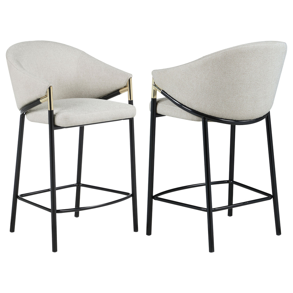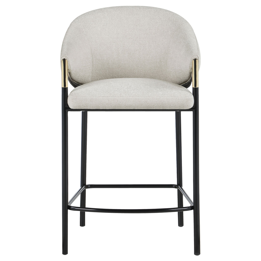 This pair of two stools offer a Hollywood regency look. With a tall and sleek design, the legs come in a glossy black finish that lends to many color palettes and offers a handsome look. Each stool has a cushioned seat, wrapped in a linen-like fabric that is soft to the touch. Plus, lean back and relax between sloped arm rests and a curved high back as you sip cocktails and chat with guests. Capping each arm rest is a gold accented piece that adds a glamorous touch. Key Features: • Tall and sleek design with glossy black finish for versatile color palettes and handsome look • Cushioned seat wrapped in linen-like fabric for soft touch and comfort • Sloped arm rests and curved high back for relaxed seating • Gold accented pieces on arm rests for glamorous touch • Hollywood regency look for stylish addition to any room