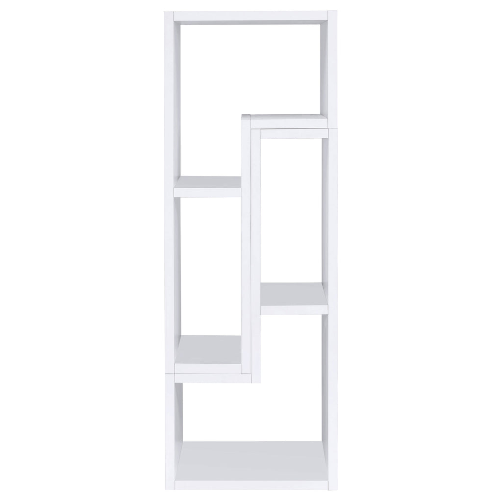 Perfect for a variety of uses, this two-piece bookcase and TV console is fabulously versatile. It allows you to switch between various bookcase and TV stand configurations for your convenience. Bold, L-shaped shelves are arranged in striking geometric designs for a modern look. A white finish enhances its contemporary appeal. Crafted from top quality materials, this bookcase is sturdy, stylish, and smart. Key Features: • An asymmetrical arrangement of shelves creates an intriguing silhouette while offering ample storage space • Two-piece bookcase with an attractive L-shape design • Constructed with MDF, particle board, and laminate • Versatile design allows you to switch between various bookcase and TV stand configuration • Available in cappuccino, white, and grey driftwood