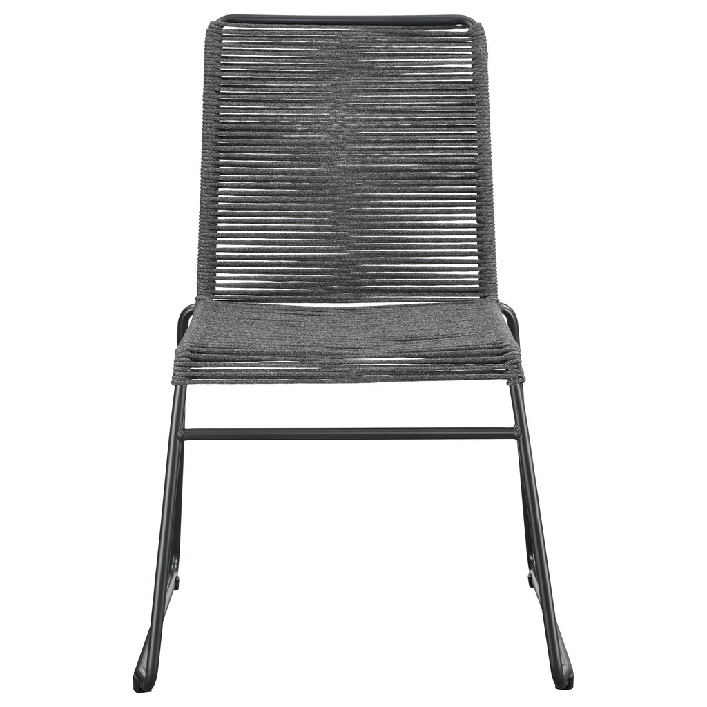 Lend a space a little texture with this contemporary rope woven chair. Designed with a sleek metal frame, a homopolymer rope weaves its way around the backrest and seat, offering a comfortable place to rest. The metal frame is made with a powder coated finish, offering extra durability and resistance. With a slim seat and angled legs, these chairs can be stowed away and stacked in a close until guests arrive. Or, better yet, place them front and center at a minimal, modern dining table or home office setup. Key Features: • These rope-woven chairs are all the rage. They come fully set up and stackable for saving space and are easy to transport • Chairs are made of metal with a powder coated finish and 100% polypropylene homopolymer rope woven by hand • Rope is extremely strong and durable. Chairs have passed 300 lbs static sitting test • Hand weaving is a labor intensive process, but the result is impressive • Chairs are recommended for indoor use only