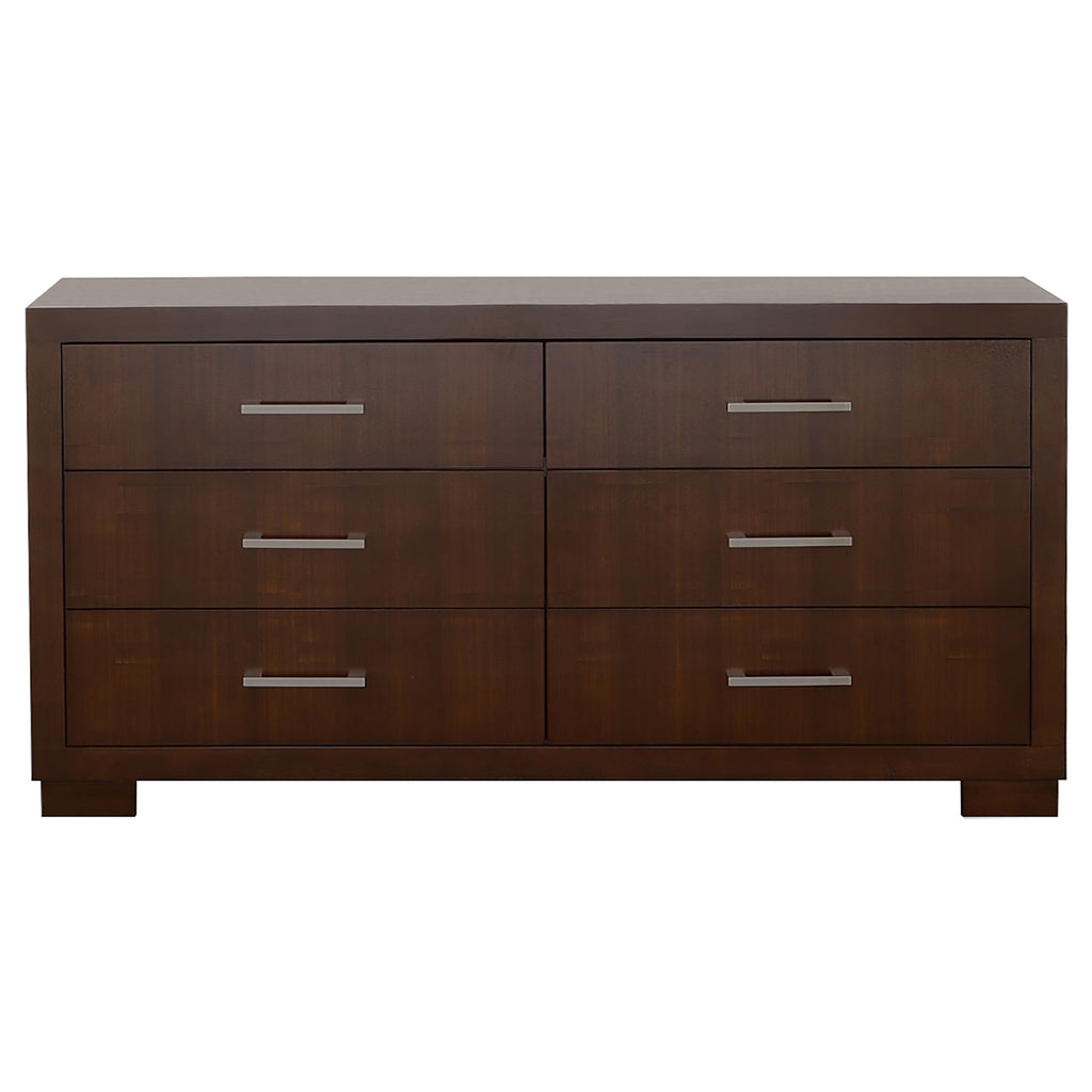 The Jessica wood bedroom set blends smart storage and sophisticated design for a refined modern retreat. Featuring a platform bed with a built-in bookcase headboard and integrated LED lighting, it offers both form and function. Each coordinating case piece is crafted from rubberwood, engineered wood, and ash veneer, complemented by silver-tone hardware for a contemporary touch. The rich cappuccino finish adds warmth, while English dovetail drawers with felt-lined tops provide practical, lasting elegance._x005F_x000D_ Key Features: • Queen bedroom set with LED-lit bookcase headboard and platform base • Includes matching dresser, mirror, and nightstand with bar hardware • Crafted from rubberwood, engineered wood, and ash veneer • Rich cappuccino finish warms up a contemporary bedroom • Felt-lined top drawers protect jewelry and delicate items • English dovetail drawer construction with smooth metal glides