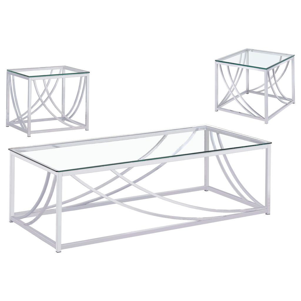 This coffee table set, including a cocktail table and end table, blends sleek modern design with practical functionality. Both pieces feature clear tempered glass tops and electroplated polished chrome frames. The curved metal accents add a contemporary, elegant touch to the design. Built with sturdy metal construction, this set is durable and stylish, making it a perfect addition to any living room or seating area. Key Features: • Coffee table set with tempered glass tops • Electroplated polished chrome frames for a sleek finish • Curved metal accents enhance modern, elegant appeal • Durable metal construction ensures lasting use • Functional surface space for versatile living room needs • Complements contemporary and sophisticated decor styles