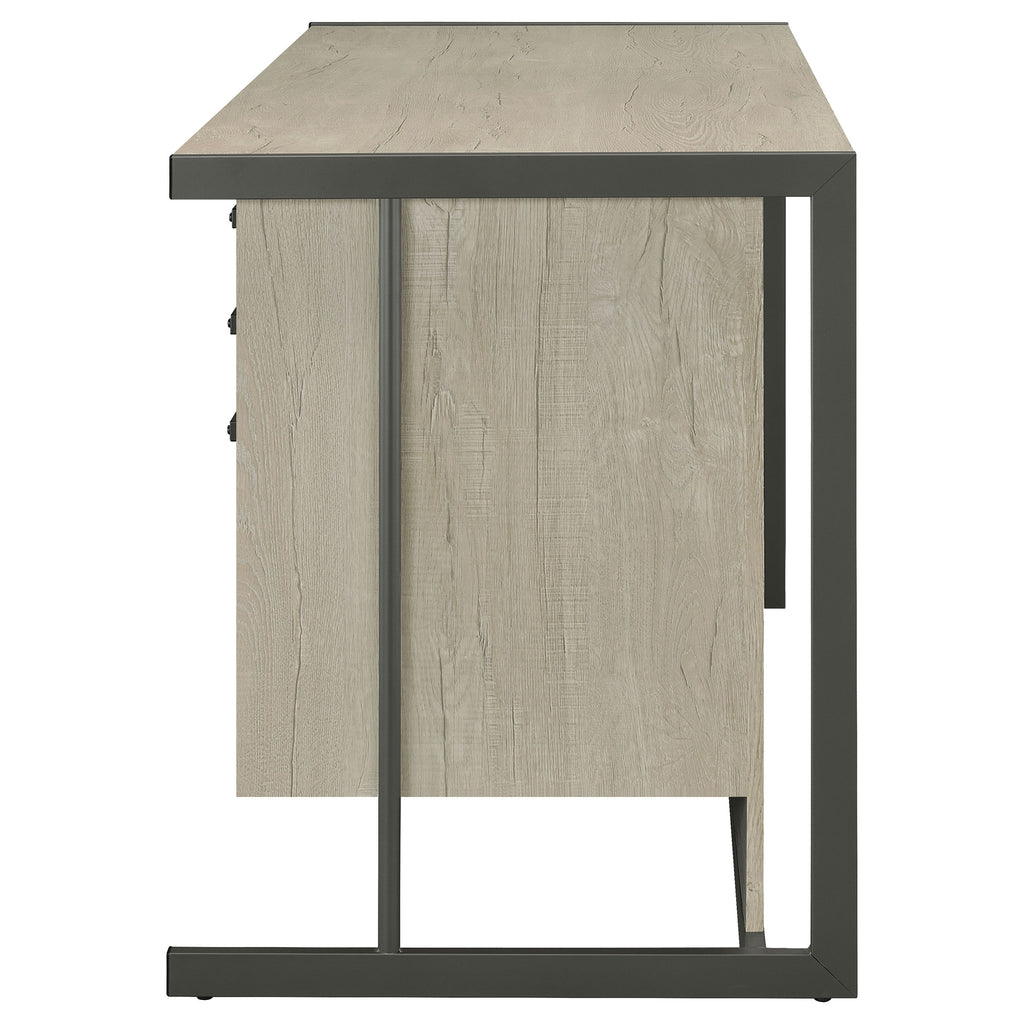 Elevate your contemporary home office and organize your supplies with this spacious contemporary office desk, featuring a light and bright whitewashed grey finish that maintains a clean look and feel to the space. Four drawers, including a deep file drawer, allow you to organize important documents, fastened with gunmetal finished pulls that coordinate with the grey finished sled style base. Key Features: • Computer desk in whitewashed grey finish with four drawers • One file drawer and three utility drawers for office essentials • Gunmetal hardware and sled legs offer industrial contrast • Wide desktop accommodates tech and multitasking activities • Durable engineered wood construction ensures long-lasting use • Modern rustic style ideal for clean and neutral office settings