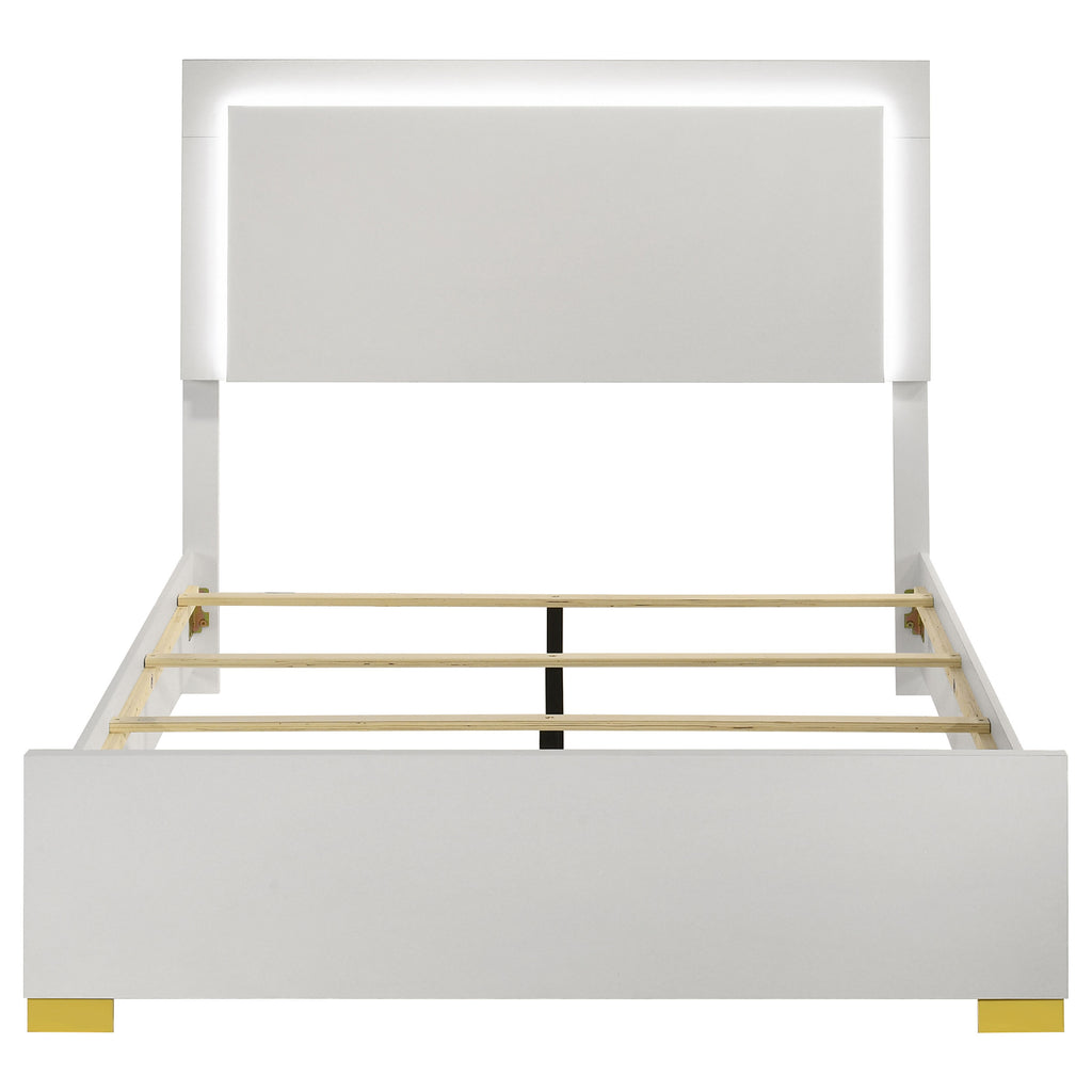 Explore the possibilities of modern features that render this chic bed a haven for relaxation and a comfy place to sleep and lounge. A stylish yet minimalist design feature is perfect for anchoring your contemporary bedroom. Assembled of wood products and melamine laminate, it offers updated and sturdy construction. Ethereal energy-efficient lighting frames its tall headboard, operated with a touch mechanism through headboard-mounted buttons. Gleaming gold metal finish feet are petite yet noticeable. Key Features: • Discover the modern conveniences that transform this chic bed into a sanctuary of relaxation and a cozy spot for both sleep and lounging • Elevate your contemporary bedroom with its stylish yet minimalist design, serving as a striking focal point • Built from wood products and melamine laminate, this bed boasts durable and contemporary construction • Enjoy the ethereal ambiance created by energy-efficient lighting framing its tall headboard, easily controlled through headboard-mounted touch buttons • Notice the elegant touch of gleaming gold metal finish feet, adding a subtle yet distinctive touch to this stylish bed
