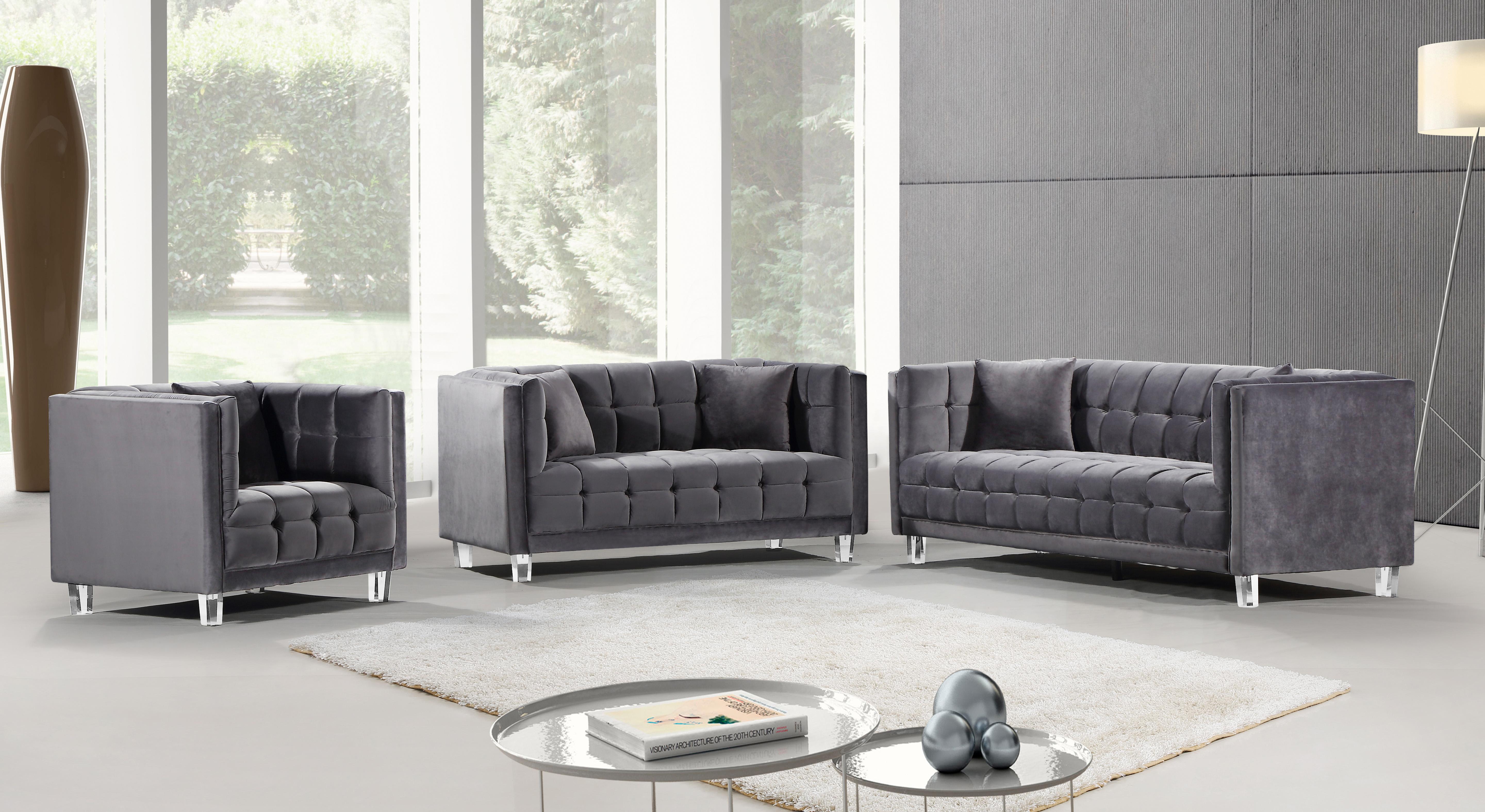 Fall in love with the soft, welcoming feel of this Mariel Grey Velvet Chair. The striking jewel-toned color velvet adds a vibrant feel to your living room or den. Plump cushions beckon you to sit down, rest a bit, and let the cares of the day roll off your back. Acrylic legs provide a modish touch while supporting the chair securely and providing clearance beneath for cleaning. Channel button tufting and a 70's inspired silhouette round out the design, giving it a decidedly contemporary look.