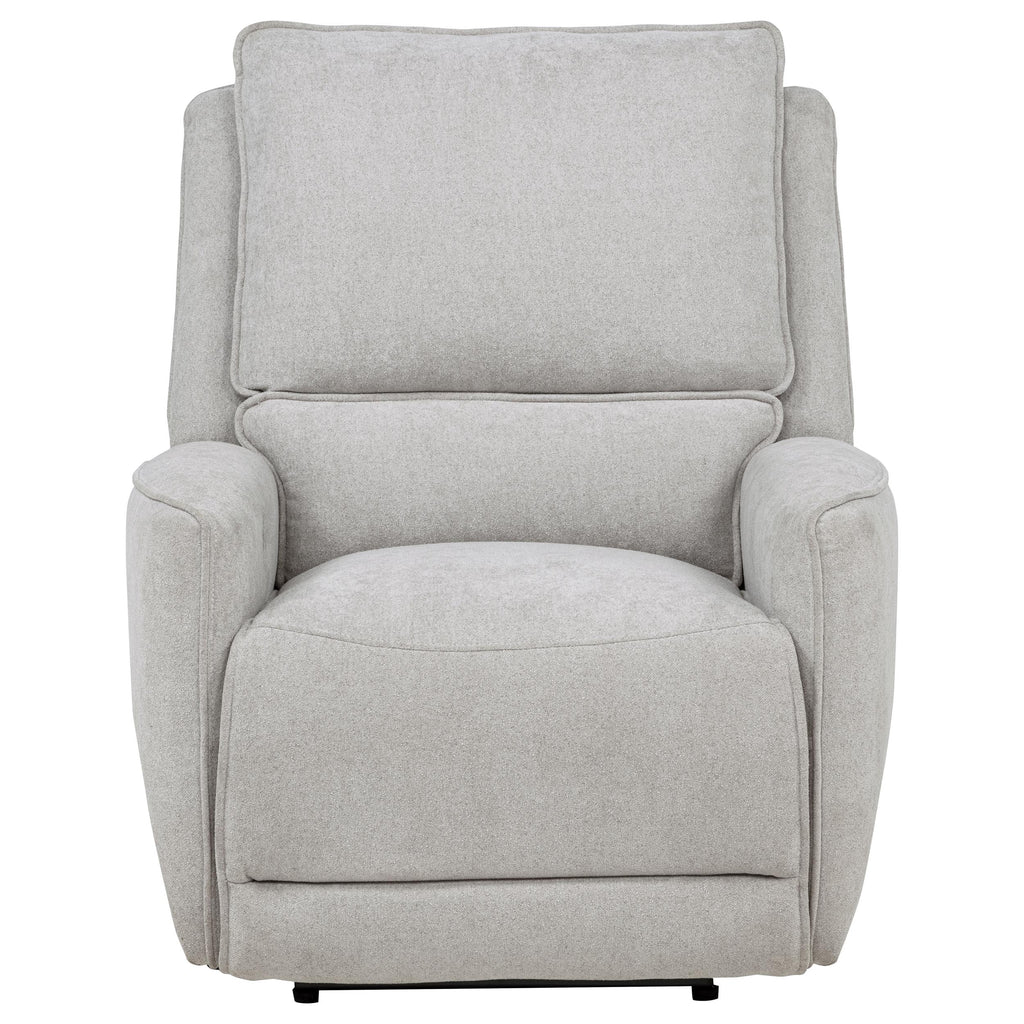 Sink into indulgent comfort with this power recliner, tailored for quiet moments and deep relaxation. Draped in soft dove grey chenille, it features sculpted cushions and gently rounded arms for an inviting silhouette. At the touch of a button, the seat extends smoothly, offering effortless recline. A built-in anti-pinch safety function halts motion when resistance is detected, making it a haven of both comfort and reassurance. Key Features: • Power recliner with sculpted form and plush padding offers cozy, modern comfort • Dove grey chenille upholstery adds softness with a clean monochrome finish • Push-button recline delivers smooth motion for customizable lounging • Supportive seat and back cushions cradle the body in relaxed alignment • Anti-pinch mechanism stops recline when resistance is detected for safety • Wrapped in soft chenille over foam with a durable wood and metal frame
