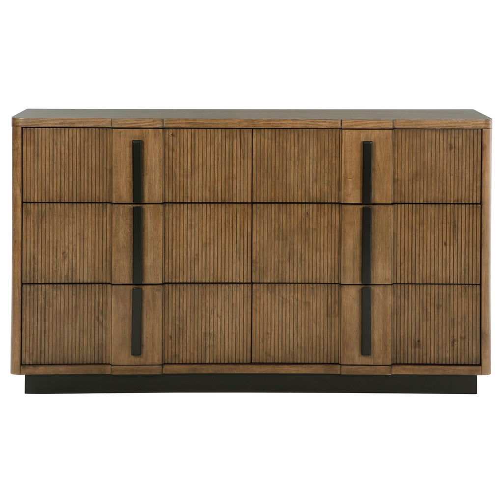 Add a stylish platform for decor and ample storage for clothing with a modern six-drawer dresser. Crafted with a cool ash brown wood grain finish, the dresser features decorative drawer fronts that turn it into a true show piece in your bedroom. Drawer fronts are subtly shaped and paired with vertical fluting that creates chic depth in an artful presentation. Thick bar pulls are turned vertical, echoing the elegant lines of the piece. Its wide top is just right for a jewelry box and decor, offering a personalized ambiance to your bedroom. Key Features: • Six roomy drawers in a modern wooden dresser create ample storage for clothing, linens, and more • An elegant cool ash brown wood finish is complemented with deep brown-toned hardware • Vertical fluting lends texture and dimensionality that creates sophisticated artistry • Vertical drawer pulls add visual interest and dimensionality to a shapely drawer front design • Drawers feature metal extension glides for smooth, seamless performance