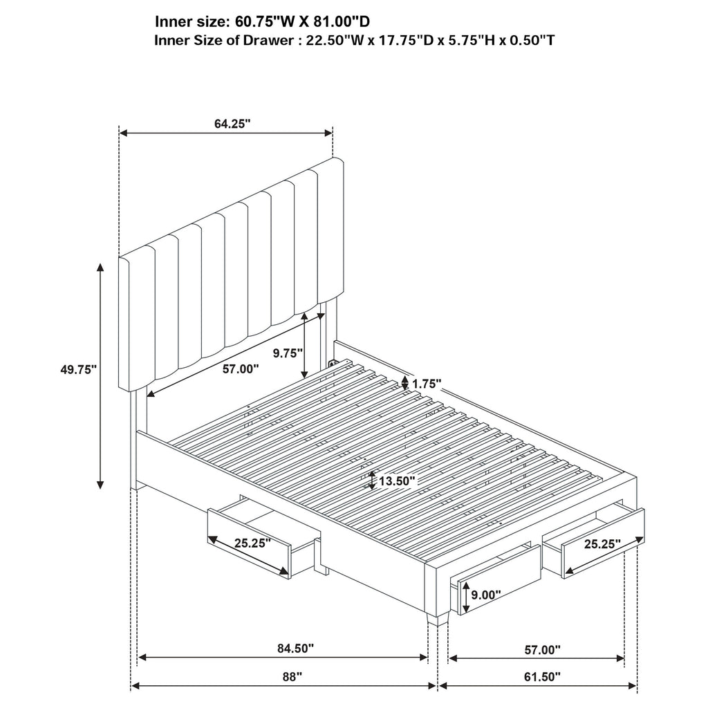 Clean lines and quiet storage come together in this upholstered platform bed, where form meets thoughtful function. The vertical channeled headboard adds a tailored touch, while built-in drawers offer seamless storage at the foot and sides. Wrapped in a soft woven fabric and anchored by a weathered mango base, it blends comfort, utility, and calm geometry. Designed for uncluttered rest, it grounds the bedroom with ease and intention. Key Features: • Upholstered queen bed with vertical channel tufting across a clean, tailored headboard • Four drawers integrated into the base for discreet side and footboard storage • Platform design supports mattress directly without the need for a box spring • Ideal for compact sleeping areas where storage and function are essential • Crafted from mahogany, engineered wood, and mango veneer throughout